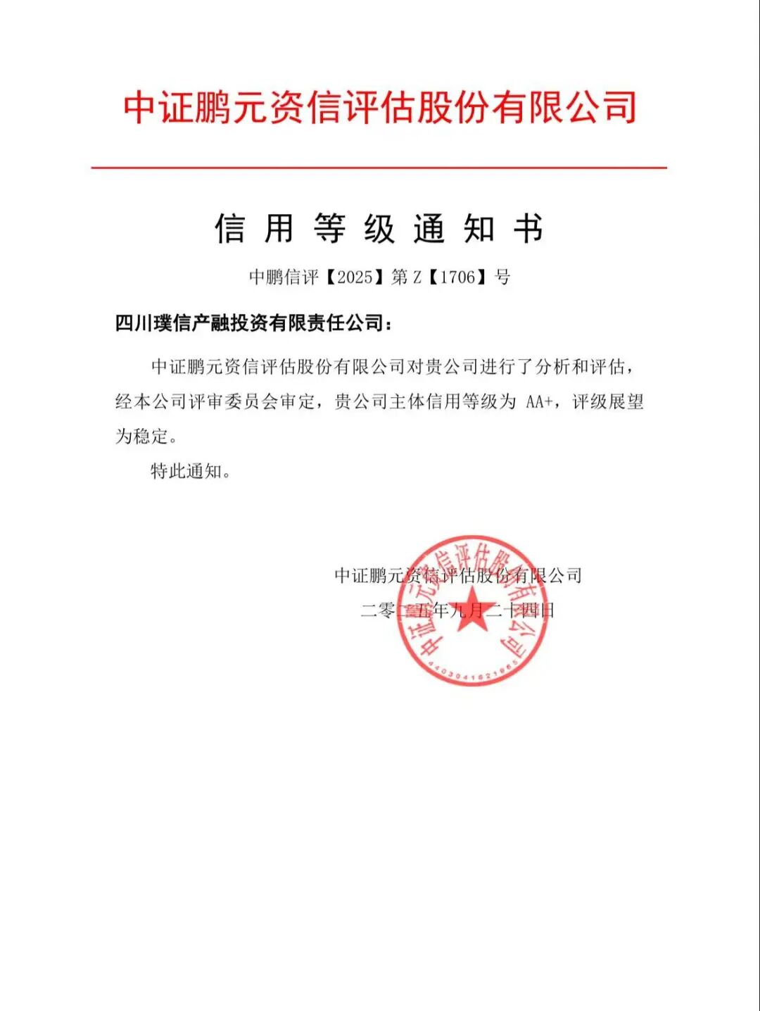 近日,国内权威信用评级机构—中证鹏元资信评估股份有限公司正式授予四川璞信产融投资有限责任公司“AA+”主体信用等级,评级展望为“稳定”。该评级结果充分体现了市场对璞信投资公司综合实力、偿债能力、风控水平及可持续发展前景的高度认可。